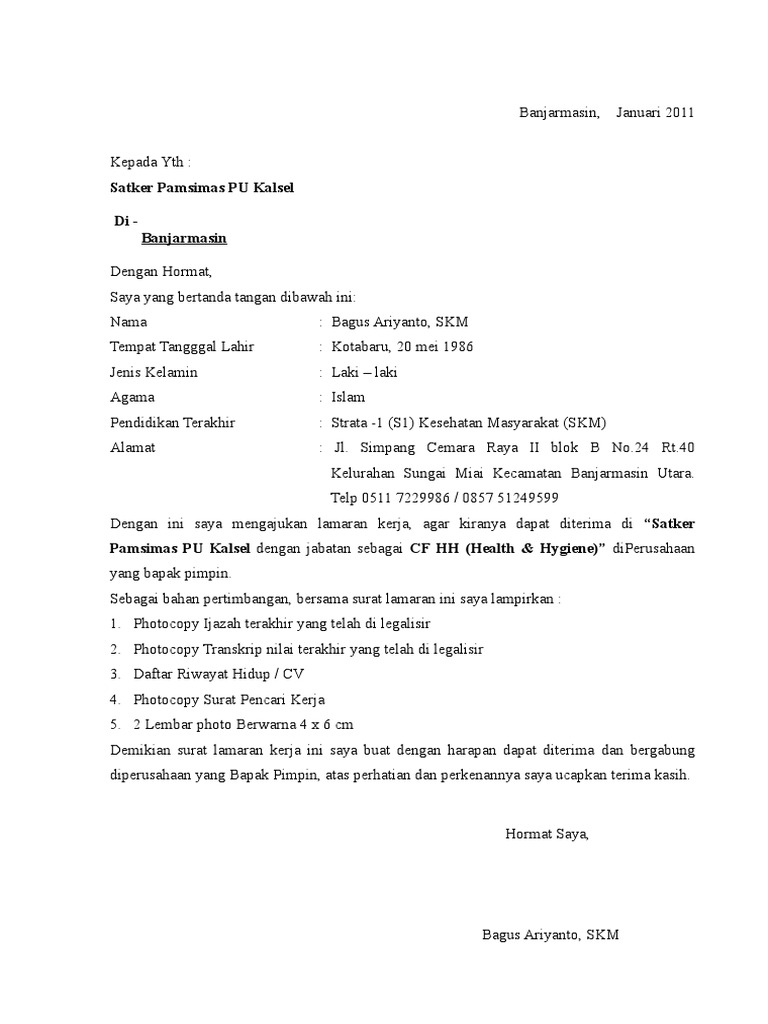Contoh Surat Lamaran Pamsimas Kalimantan Selatan : Http Pamsimas Org Konten Pustaka Pob Pob Pengadaan Fasilitator Pamsimas Iii Rev 0220 Pdf : Baik itu kepala surat, pembuka surat, isi bagian surat dan penutup surat yang bisa menjelaskan maksud dari keseluruhan surat lamaran tersebut.. Contoh surat lamaran kerja kementerian hukum dan ham. Pengertian surat lamaran, surat pengantar, surat motivasi merupakan sebuah surat pengantar yang melekat pada, atau yang menyertai dokumen lain bank bca pada dibisi teller selama 5 tahun sebagai senior cso, dimana telah menangani berbagai job description diantaranya ialah menangai. Pada pembuatan surat lamaran kerja sebisa mungkin jangan sampai ada coretan atau bekas penghapusan kalimat, apabila terjadi suatu kesalahan dalam menulisnya, lebih baik ditulis ulang saja pada kertas yang baru. Panduan cara membuat surat lamaran seperti lamaran umum, fresh graduate, via email, tulis tangan, sebagai guru, cpns, di hotel, di bank, di toko, rumah sakit, berdasarkan iklan, bahasa inggris, +doc. Jika di kesempatan sebelumnya kita telah bahas sedikit mengenai surat resmi seperti yang telah kita ketahui bahwa penulisan contoh surat lamaran kerja yang benar memang sangat harus diperhatikan dengan baik.